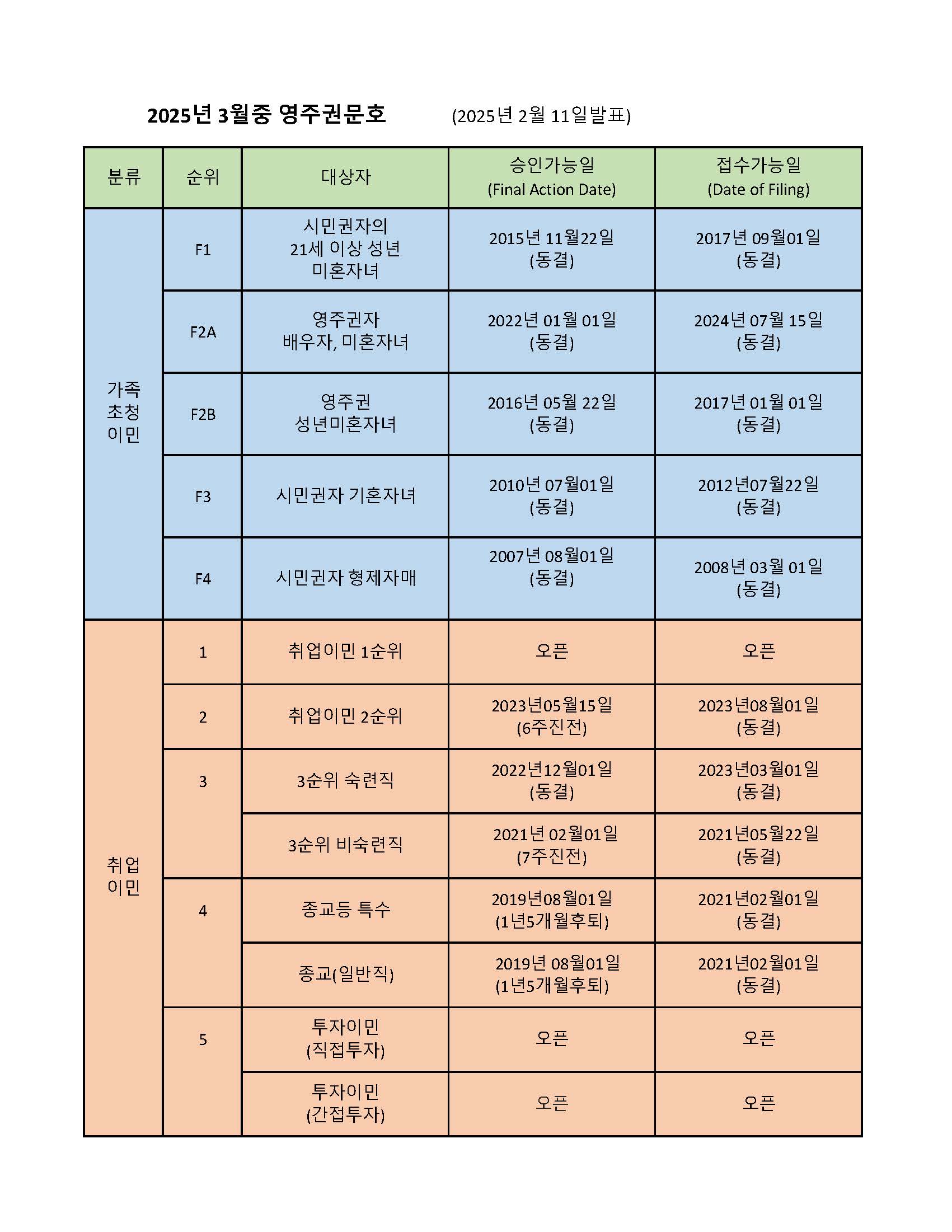 미국 국무부(DOS)는 2월 11일 2025년 3월중 영주권문호(Visa Bulletin)를 발표했습니다. 3월 영주권문호에서는 가족이민은 모두 승인가능일(Final Action Date)과 접수가능일(Filing Date)모두 단 하루도 진전이 없이 지난달 문호와 동일하게 발표되었습니다.