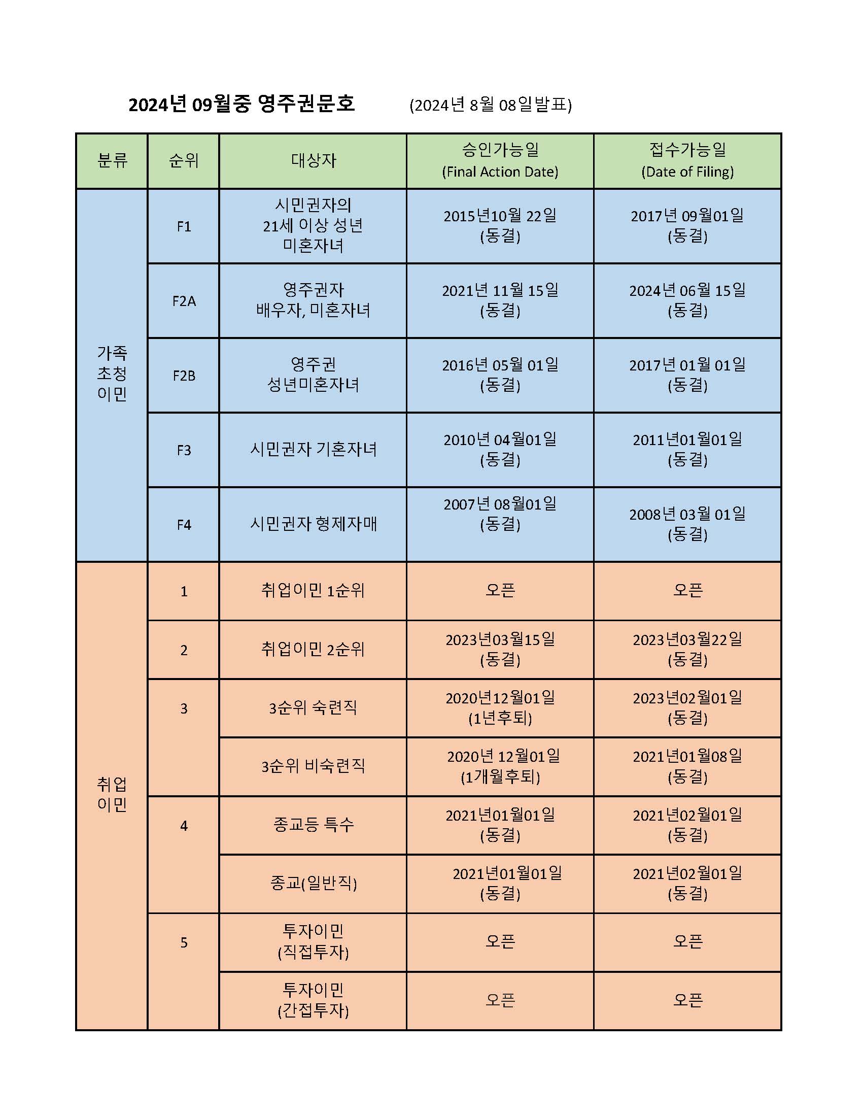 2024년 9월의 영주권 문호에서 시민권자의 21세이상 성년미혼자녀들이 대상인 가족이민 1순위는 승인가능일 (Final Action Date) 이 2015년 10월 22일로 동결 되었으며, 접수가능일 (Filing Date)도 2017년 9월 1일로 동결 되었습니다.