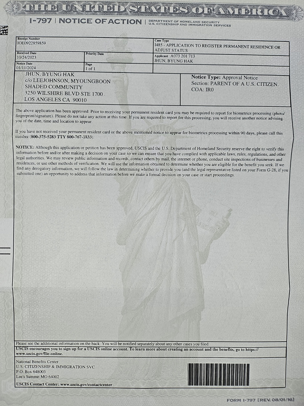그늘집에서 2023년 10월 24일 이민국에 접수한 시민권자 부모초청 영주권 케이스가 2024년 1월 11일자로 인터뷰 없이 승인되었고 2024년 1월22일 영주권 카드를 배달 받았습니다.