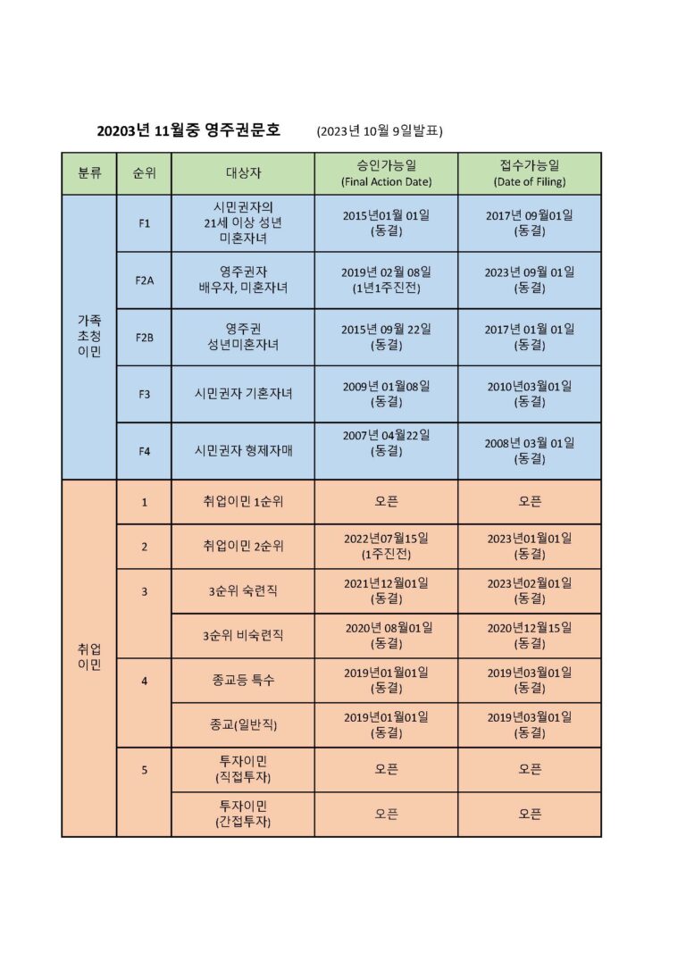 국무부가 10월 9일 발표한 2023년 11월의 영주권 문호에 따르면 로 취업이민 1순위 승인가능일(Final Action Date)이 계속 오픈되었으며 2순위 승인가능일(Final Action Date)만 유일하게 1주 진전에 그쳤으며 가족이민의경우 모두 지난달 날짜로 동결 되었습니다.