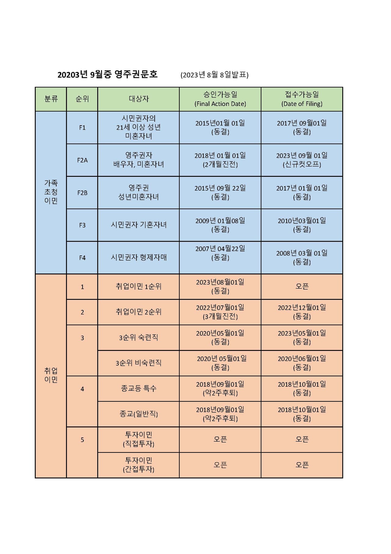 국무부가 8월 8일 발표한 2023년 9월의 영주권 문호에 따르면 로 취업이민 1순위 승인가능일(Final Action Date)이 지난달과 동일하고 3순위 숙련직과 비숙련직도 동결되었으며 가족이민의경우 카테고리에 따라서 2주에서 2개월 전진되었으며 접수가능일(Filing Date)의경우 대부분 지난달 날짜로 동결 되었고 영주권자배우자와 21세미만 미혼자녀가 신규로 컷오프가 지정되었습니다.
