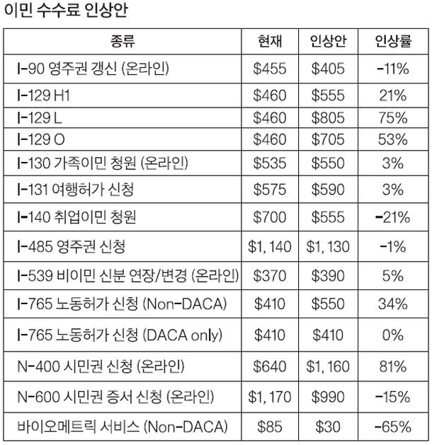 I-765는 410달러에서 550달러로 34%가 인상되었는데 청소년추방유예(DACA)는 410달러로 유지되며, I-131은 575달러에서 590달러로 소폭 올랐습니다.