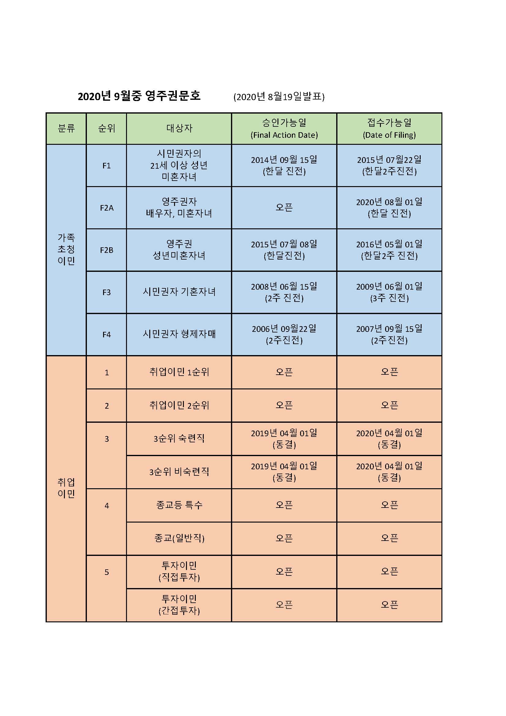 2020년 9월 1일부터 적용되는 9월의 영주권 문호 에서는 취업이민 1순위와 2순위 승인가능일(Final Action Date)이 계속 오픈되었으며 3순위는 승인가능일(Final Action Date)과 접수가능일(Filing Date)은 지난달 날짜로 동결되었습니다.
