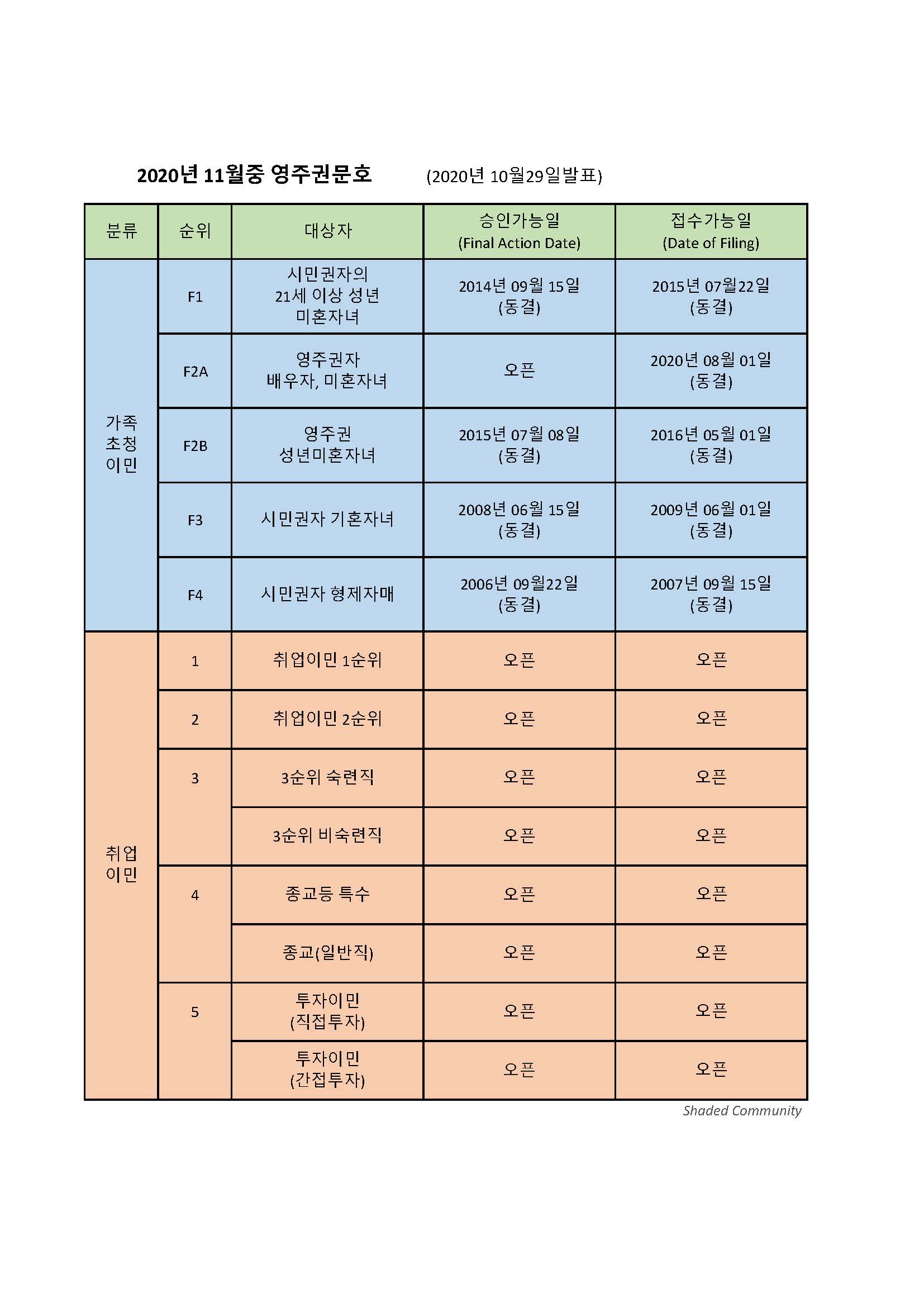 미 국무부가 29일 발표한 11월의 영주권 문호에서는 영주권을 승인받을 수 있는 승인가능일(Final Action Date)과 접수가능일(Filing Date)은 취업이민 1순위(EB-1)와 취업이민 2순위(EB-2),취업이민 3순위(EB-3),취업이민4순위(EB-4),취업이민5순위(EB-5) 모두 오픈으로 발표 되었습니다.