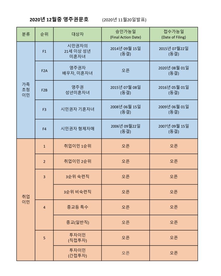 미 국무부가 20일 발표한 12월의 영주권 문호에서는 영주권을 승인받을 수 있는 승인가능일(Final Action Date)과 접수가능일(Filing Date)은 취업이민 1순위(EB-1)와 취업이민 2순위(EB-2),취업이민 3순위(EB-3),취업이민4순위(EB-4),취업이민5순위(EB-5) 모두 오픈으로 발표 되었습니다.