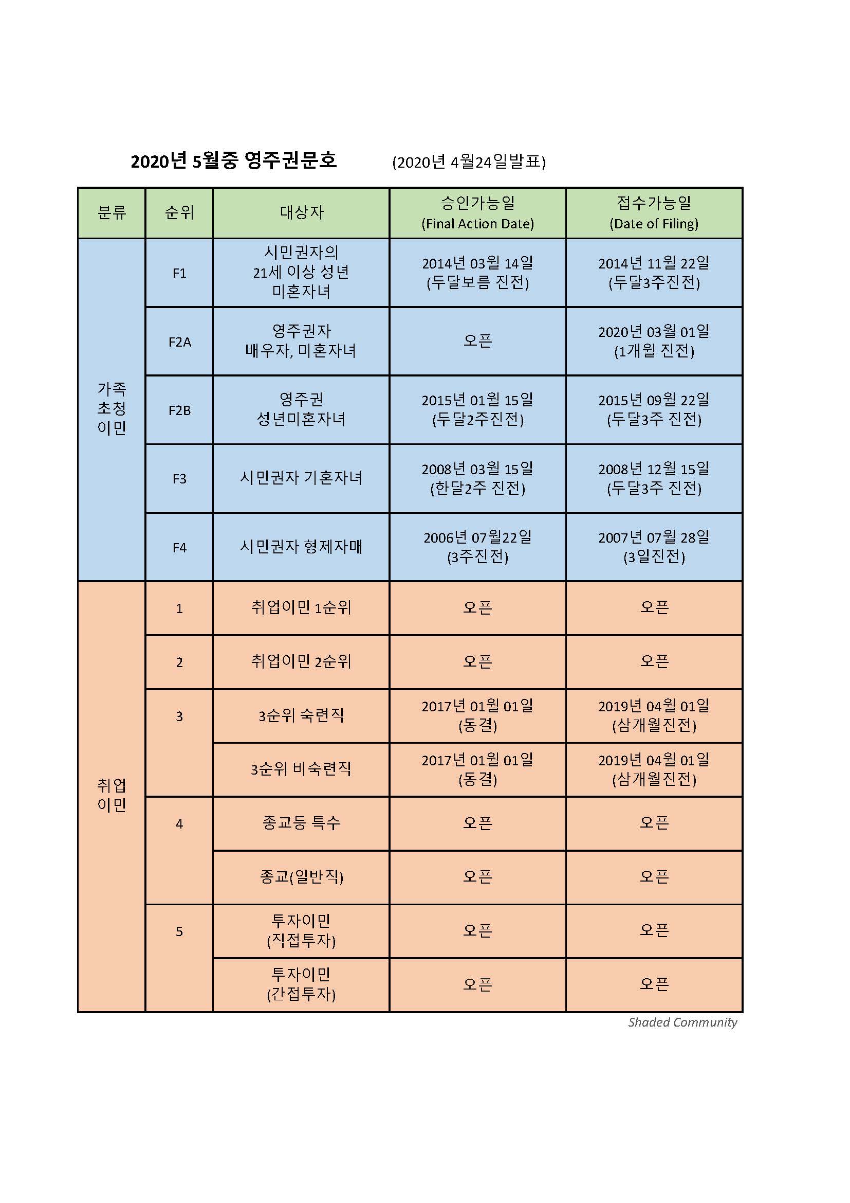 2020년 5월 1일부터 적용되는 5월의 영주권 문호 에서는 취업이민 1순위 승인가능일(Final Action Date)이 오픈되었으며 3순위 접수 가능일접수가능일(Filing Date)이 3개월 진전 되었습니다.