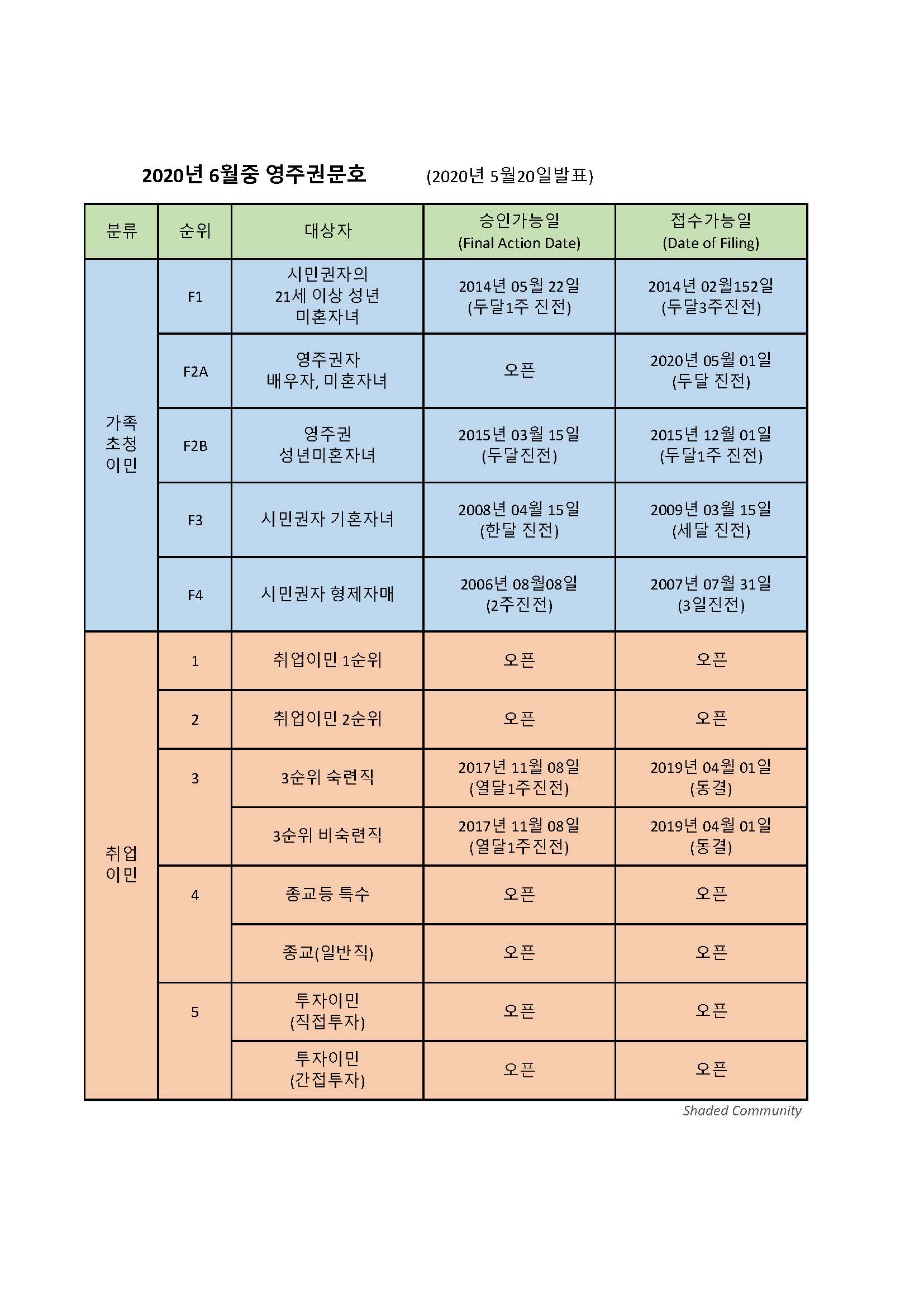 2020년 6월 1일부터 적용되는 6월의 영주권 문호 에서는 취업이민 1순위와 2순위 승인가능일(Final Action Date)이 계속 오픈되었으며 3순위는 10개월 1주가 진전되었으며 3순위 접수가능일(Filing Date)은 동결 되었습니다.