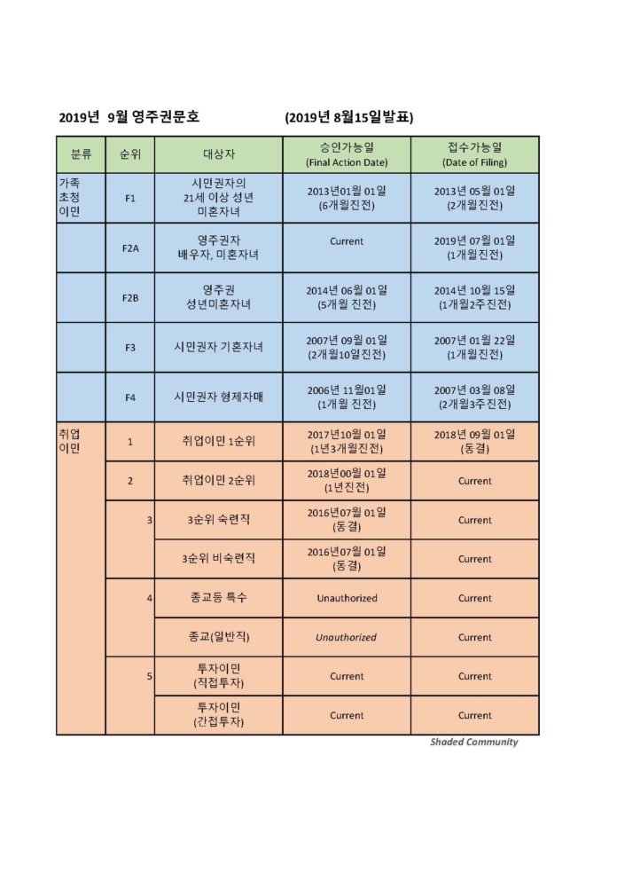 9월 1일부터 적용되는 9월의 영주권 문호 에서는 취업이민 1,2순위 승인가능일(Final Action Date)이 모두 6개월10일씩 진전되고 3순위는 지난달로 동결되고,가족이민 승인일은 가족 2A순위(영주권자의 배우자 및 미성년 미혼자녀)는 계속 오픈되고 다른 순위도 1~6개월씩 큰폭의 진전을 보였습니다.