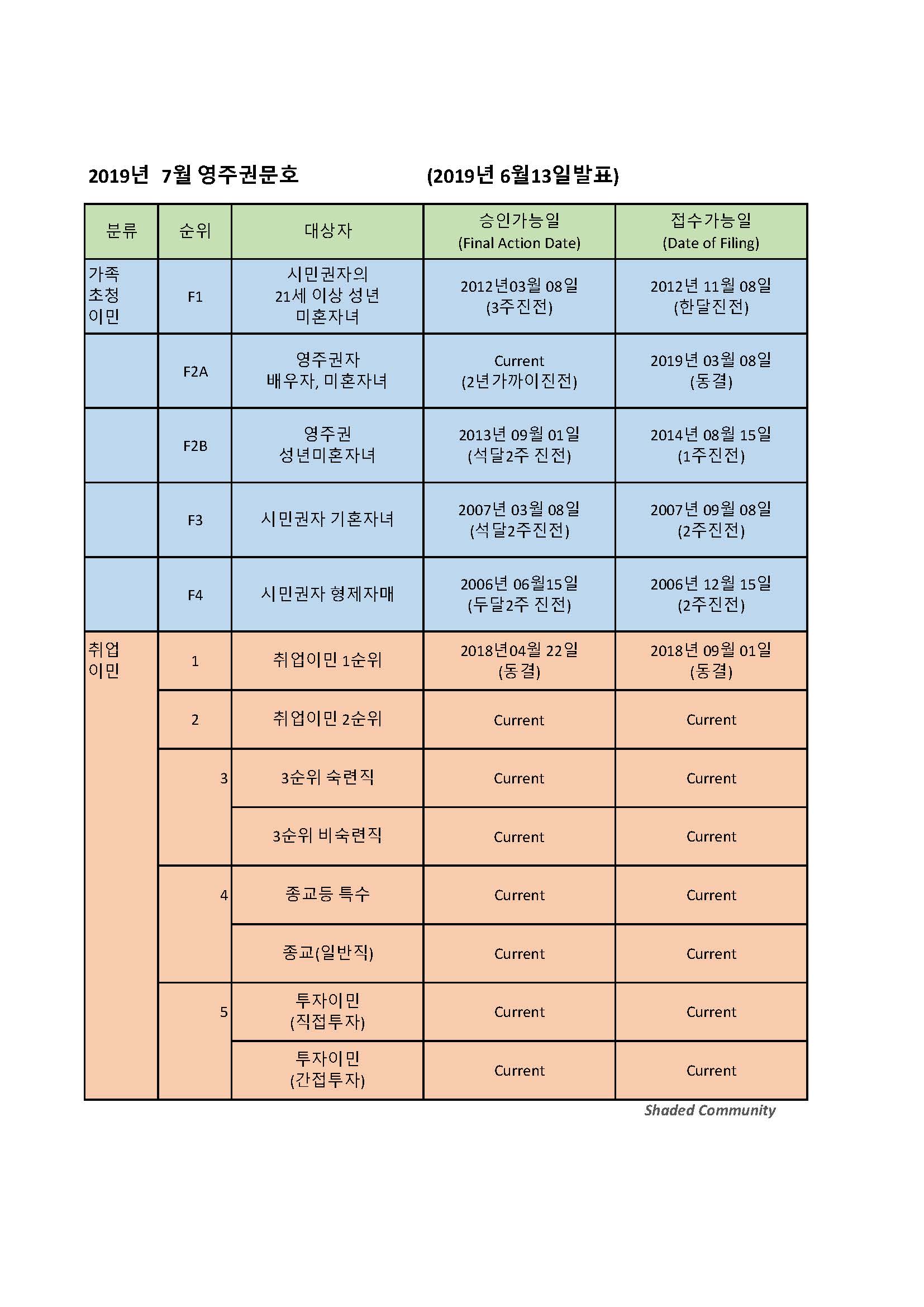 7월 1일부터 적용되는 7월의 영주권 문호 에서는 취업이민은 1순위 승인가능일(Final Action Date)과 접수가능일(Filing Date)이 모두 동결되었으며 다른 순위들은 승인가능일과 접수가능일이 모두 오픈되었습니다.