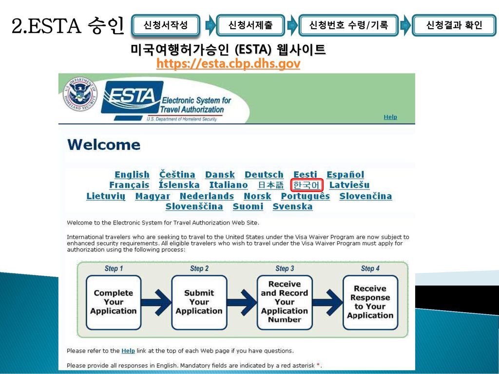 전자여행허가제(ESTA)는 비자면제프로그램(VWP)을 이용하여 미국을 방문하고자 하는 여행자의 자격여부를 확인할 수 있는 인터넷 기반의 신청서입니다. 여행객들은 미국으로 입국하기 위해 작성하는 출입국 신고서(I-94W)에 기입하는 정도의 정보를 전자여행허가제 신청서에 입력하게 됩니다. 비자면제프로그램을 이용하여 미국으로 여행하는 분들은 항공/선박에 탑승하기 이전에 전자여행허가 승인을 받아야 합니다.