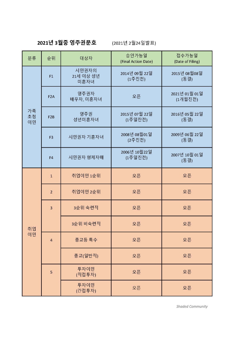2021년 3월의 영주권 문호 에서는 취업이민 모든순위의 승인가능일(Final Action Date)과 접수가능일(Filing Date)이 계속 오픈 상태가 유지 되었습니다.