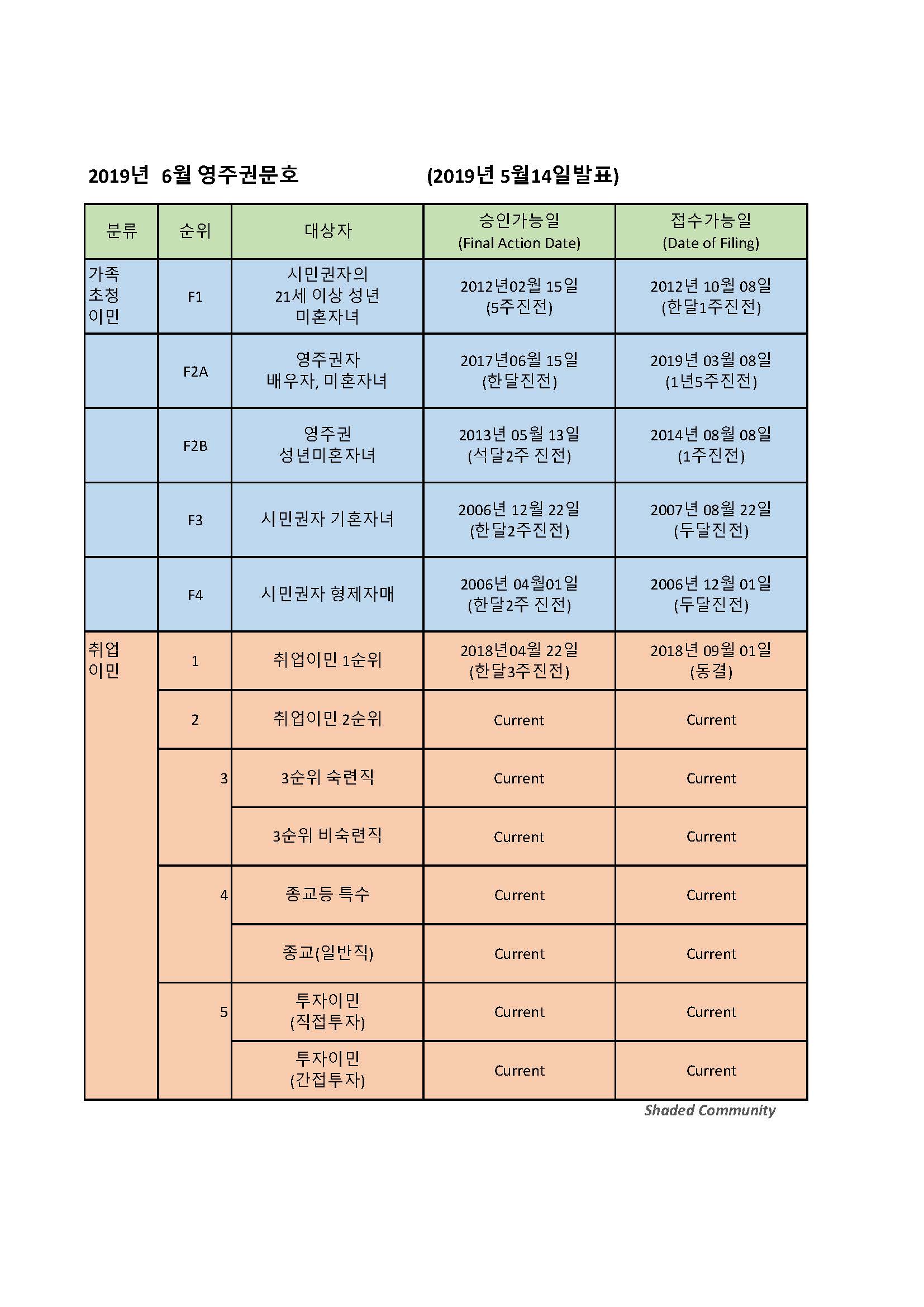 6월 1일부터 적용되는 6월의 영주권 문호 에서는 취업이민은 1순위 승인가능일(Final Action Date)이 한달3주 진전되고 다른 순위들은 승인가능일과 접수가능일(Filing Date)이 모두 오픈되었습니다.