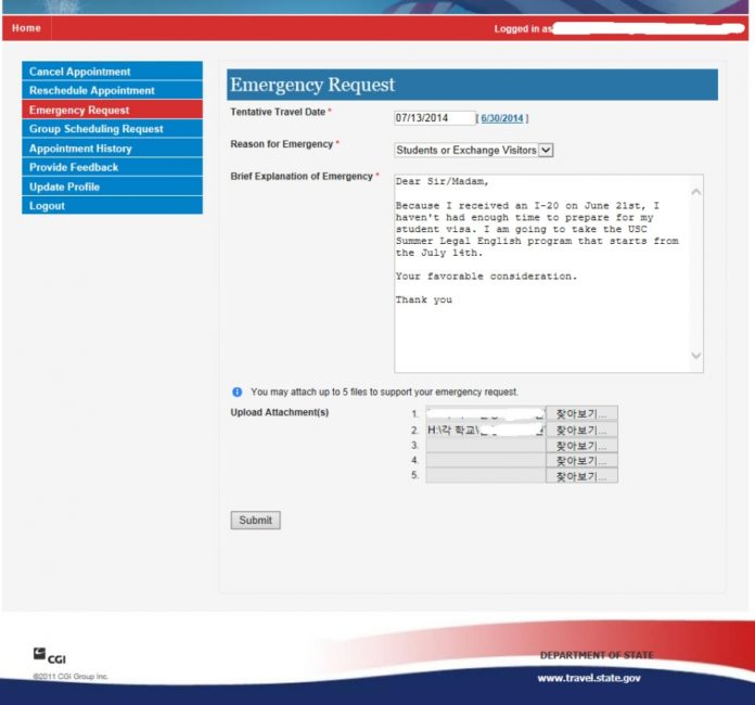 긴급 예약 요청시 신청인의 긴급상황을 자세하게 기재해 제출해야 합니다. 요청 후 주한미국대사관으로부터 회신을 기다려야 합니다.