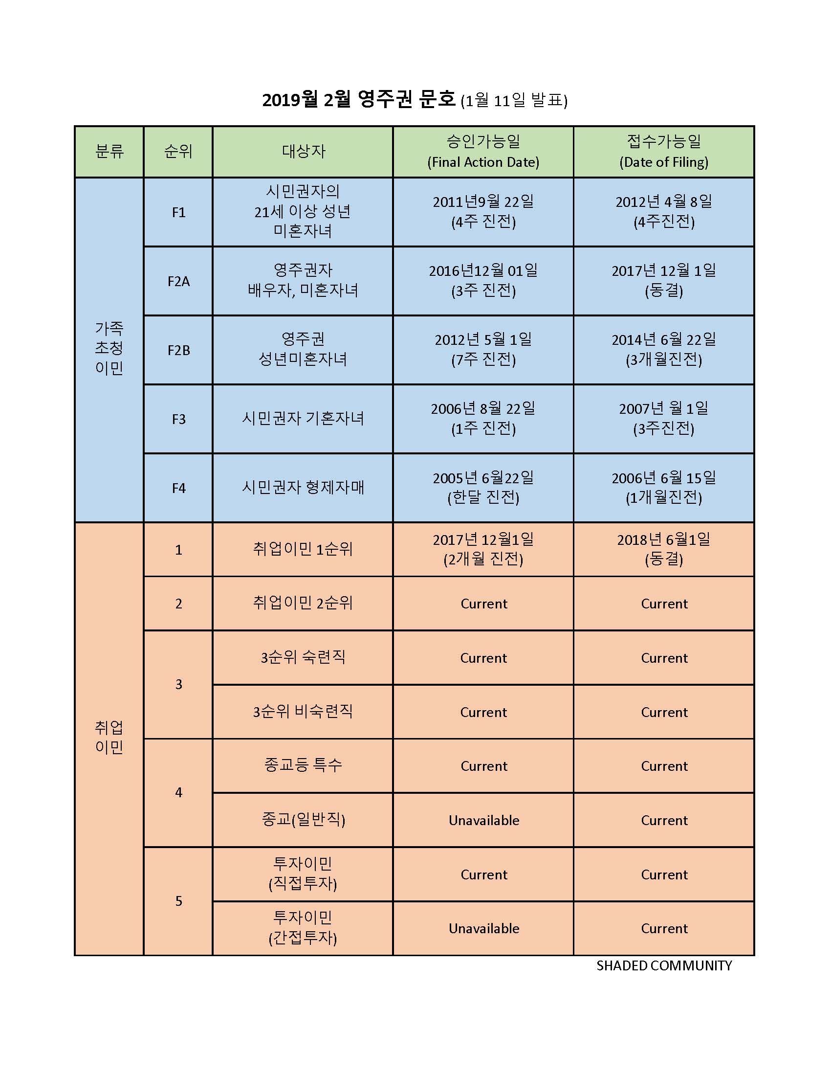 국무부가 1월 11일 발표한 2019년 새해 1월 영주권 문호에서 취업이민은 1순위 승인가능일이 2개월 진전되고 다른 순위 들은 지난달과 동일하게 오픈되었고 연방정부가 셧다운된 지난달 21일 이후 영주권 수속이 올스톱된 취업 4순위 비성직자 종교이민 부문과 취업 5순위 50만달러 투자이민 부문 등에 대한 영주권 문호 중단을 예고 되었습니다.