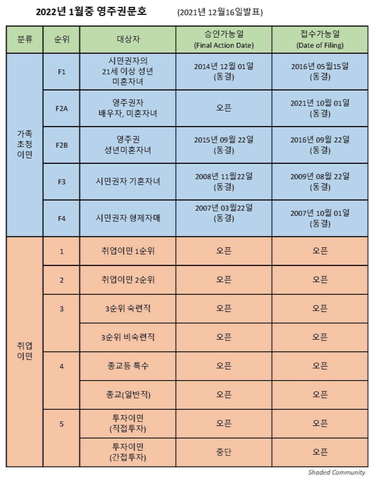국무부가 12월 16일 발표한 2022년 1월의 영주권 문호에서는 가족이민중 영주권자의 배우자와 미성년 자녀(F2A) 순위만 연속 오픈되었고 나머지 순위와 취업이민 전순위에서 영주권을 승인받을 수 있는 승인가능일(Final Action Date)과 접수가능일(Filing Date)이 12월 문호 날짜로 동결 되었습니다.