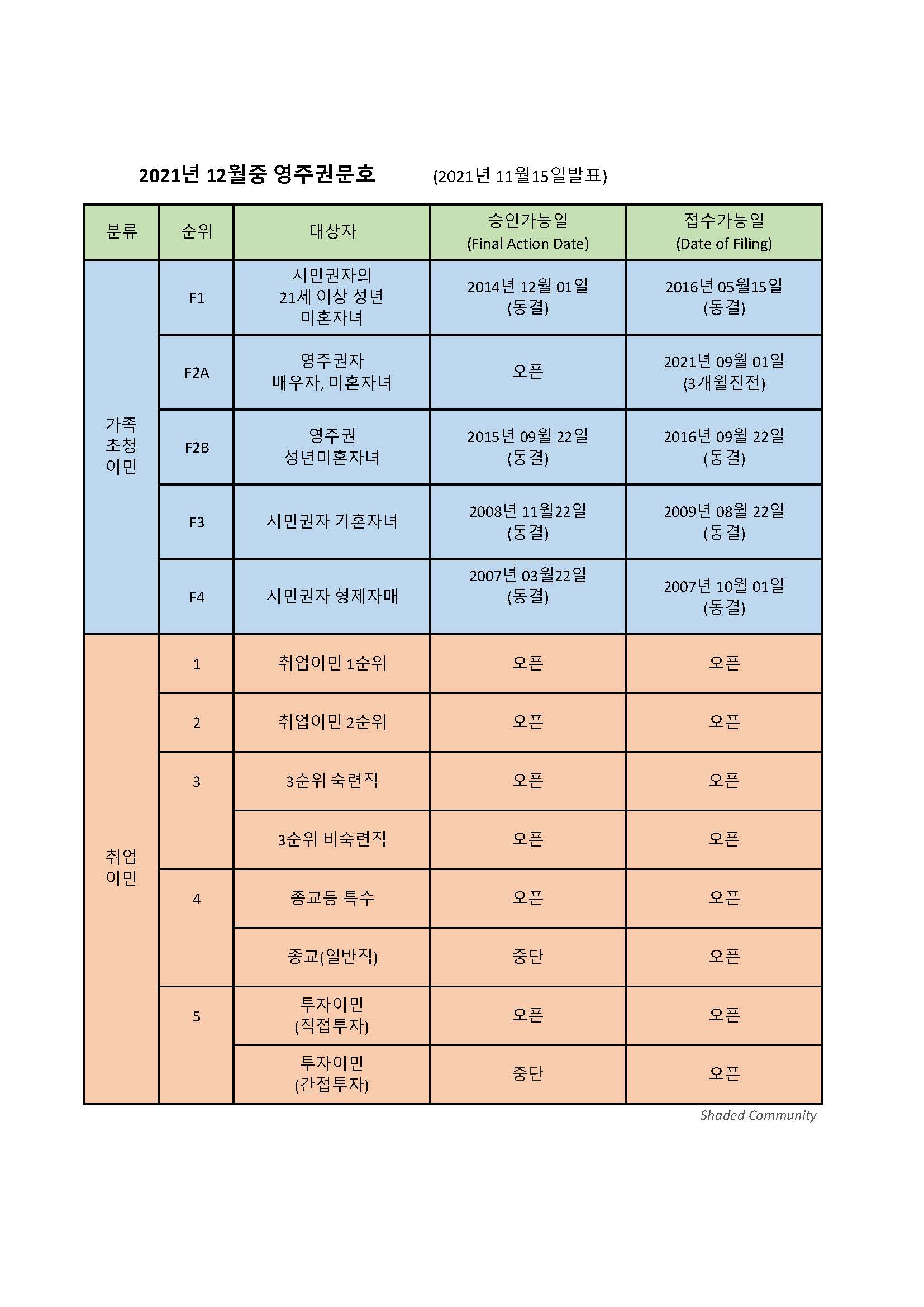 그러나 2021년 12월의 영주권 문호 에서는 취업이민 모든순위의 승인가능일(Final Action Date)과 접수가능일(Filing Date)이 연속 오픈 상태가 유지 되었습니다. 다만 종교이민 일반직과 EB-5 리저널센터 프로그램은 12월중에도 승인이 일시중단 되었습니다.