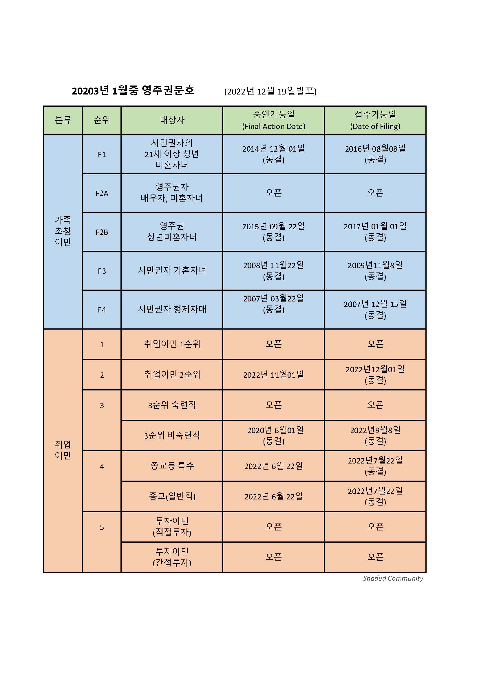 국무부가 12월 19일 발표한 2023년 1월의 영주권 문호가 가족이민과 취업이민이 모두 전달과 동일하게 우선일자가 지정되었습니다.
