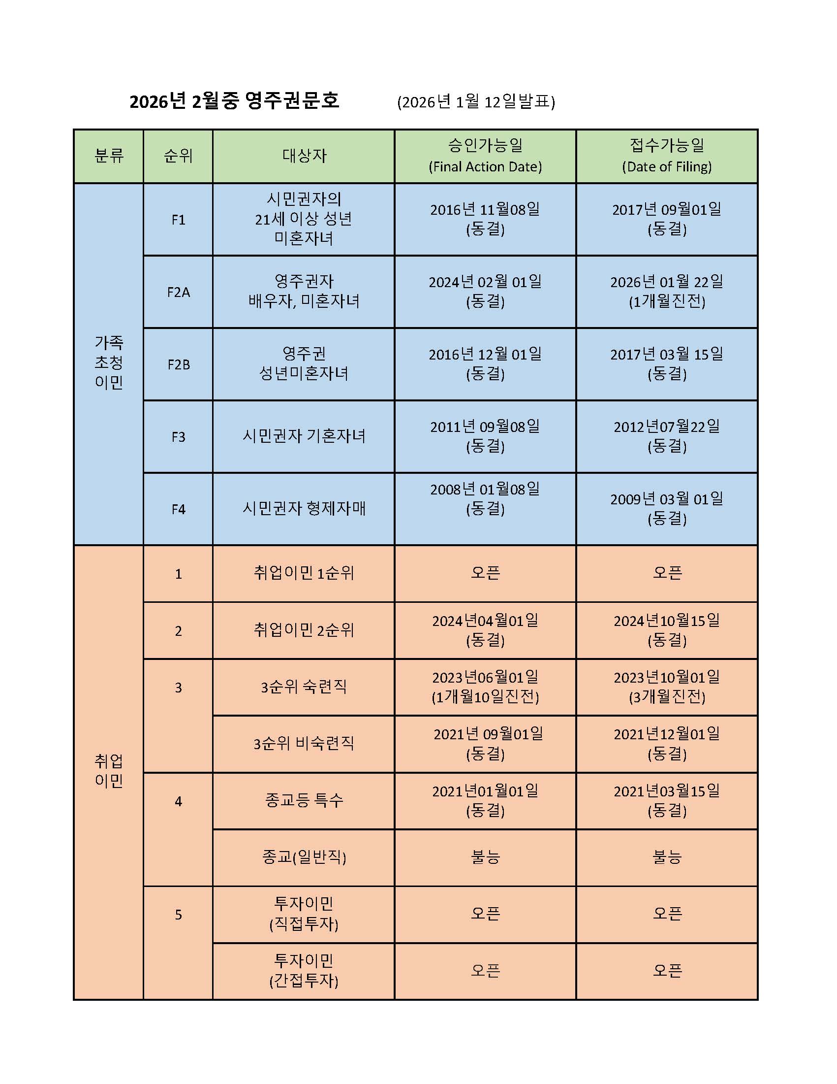 미국 국무부(DOS)는 1월 12일 2026년 2월중 영주권문호(Visa Bulletin)를 발표했습니다.