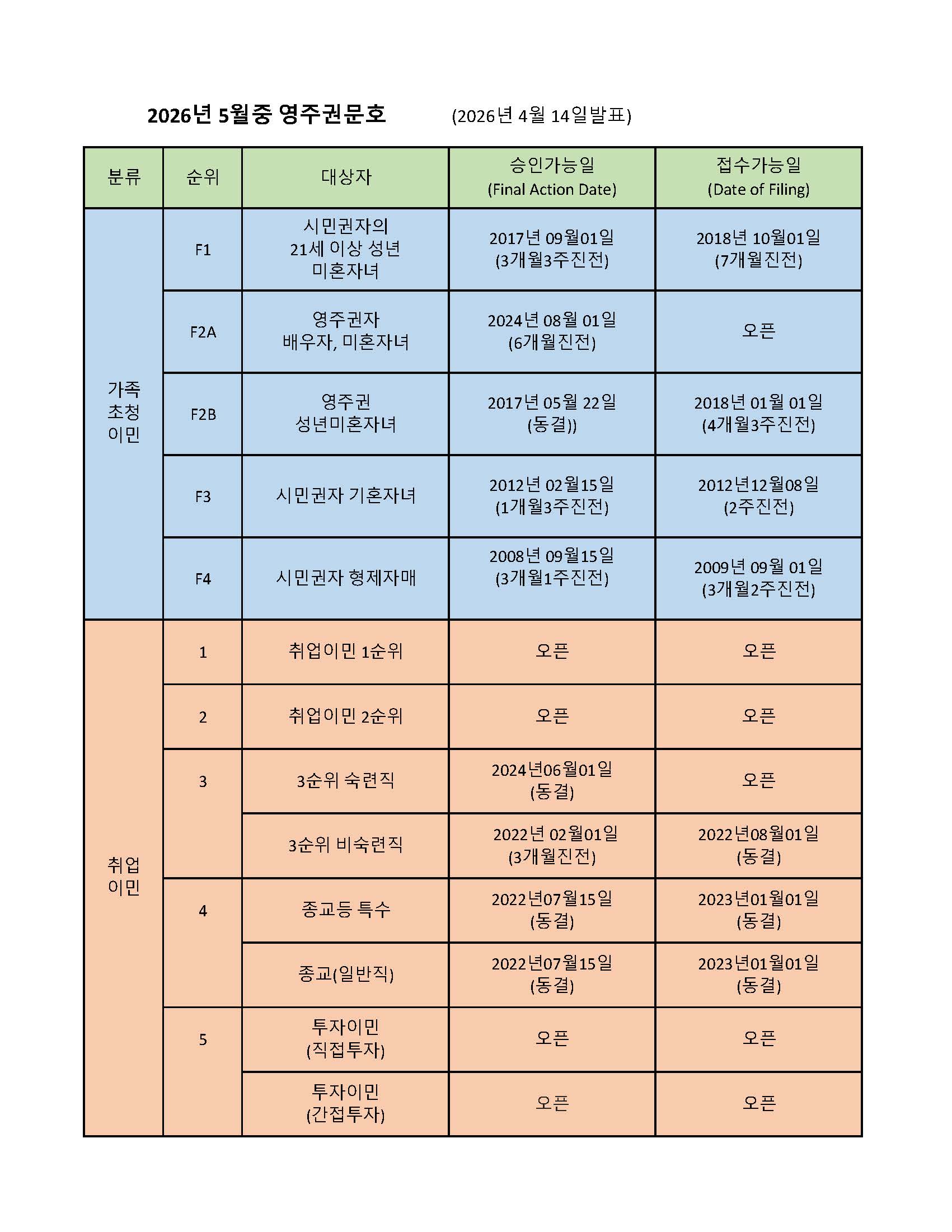 취업이민 1순위와 2순위의 승인가능일(Final Action Date)과 접수가능일(Filing Date)이 모두 오픈되었습니다.