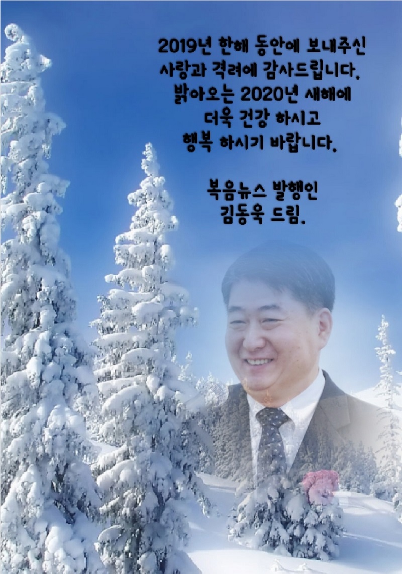 어제부터 카카오톡으로 전송하고 있는 신년 인사 카드이다. 투병 중에도 늘 복음뉴스와 나를 위하여 기도해 주시는 김원영 집사님께서 만들어 보내주신 카드이다. 내가 만들어 주십사고 부탁을 드린 것이 아니라, 김 집사님께서 '자원하여' 만들어 보내주셨다. 나는 김 집사님께서 이렇게 예쁜 카드를 만드는 재주를 갖고 계신지도 모르고 있었다. 카드를 받으신 분들께서 "카드가 참 예쁘네요!" 라는 답을 보내주신 분들이 많다. 예쁜 카드를 만들어 주신 김 집사님께도, 예쁜 카드라고 칭찬해 주신 분들께도 감사드린다.