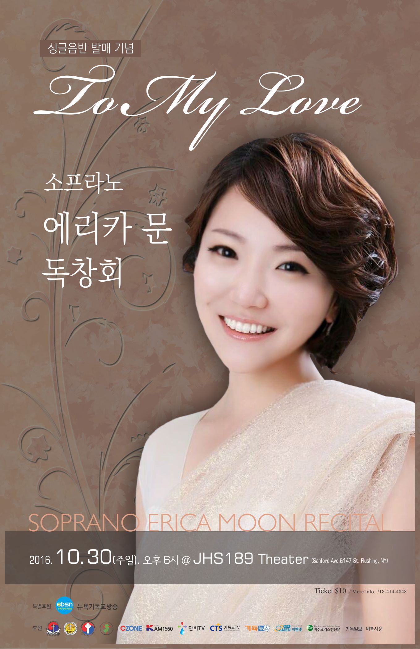 10월 30일(주일) 오후 6시 뉴욕 JHS 189 극장(Sanford Ave & 147St. Flushing)에서 열리는 공연에서는 오페라 하이라이트, 국내가곡, 크로스오버, 찬양 등 다양한 무대를 선보일 예정이다. 에리카 문이 작사 작곡한 'To My Love'는 한 사람이 드디어 진심으로 사랑하는 이를 만나 평생을 함께 하자고 고백하는 약속의 세레나데이며 아이튠즈, 네이버뮤직, 지니뮤직, 엠넷, 멜론, 벅스뮤직 등에서 다운로드 받아 들을 수 있다. 에리카 문의 두 번째, 세 번째 앨범은 올 겨울과 내년 봄에 발매될 예정이다.